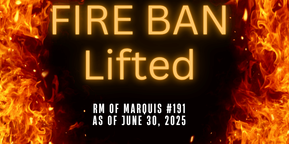 Jun302025R.M. of MarquisPlease be advised that as of June 30, 2025 the fire ban for the R.M. of Marquis has been lifted. Category: R.M. of MarquisJune 30, 2025 Share this post Share on FacebookShare on Facebook Share on XShare on X Post navigationPreviousPrevious post:New Office HoursNextNext post:Office ClosureRelated PostsOffice ClosureSeptember 2, 2025New Office HoursJune 17, 2025FOR SALE BY TENDERMarch 24, 2025Dust Control 2025March 19, 2025Rescheduled Meeting-Public NoticeFebruary 12, 2025Christmas HoursNovember 13, 2024